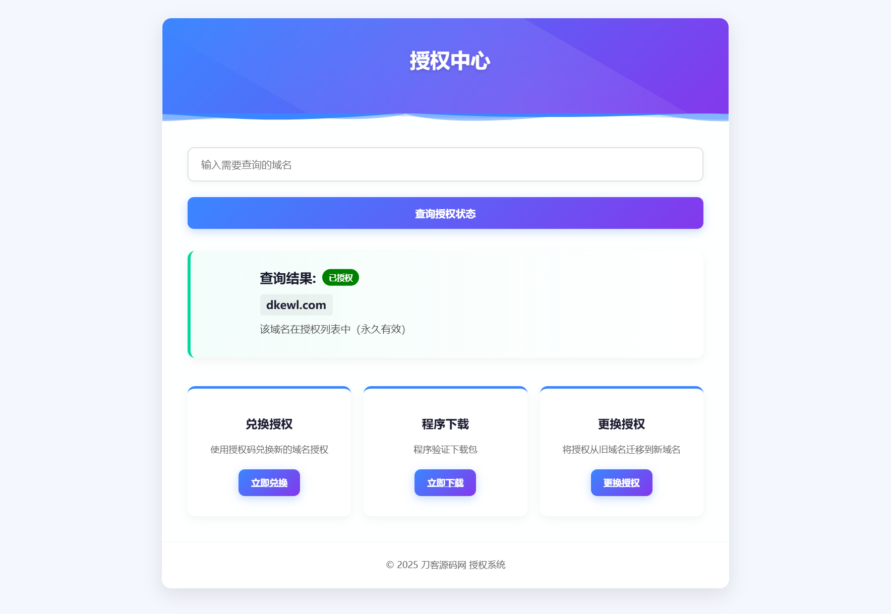 测试了一下,里面有一个文件有加密,其他的都是开源的,不影响二开,功能也满足日常所需,前端挺简洁美观,支持查询授权、卡密兑换授权、程序下载,更换授权等,自适应手机/电脑端