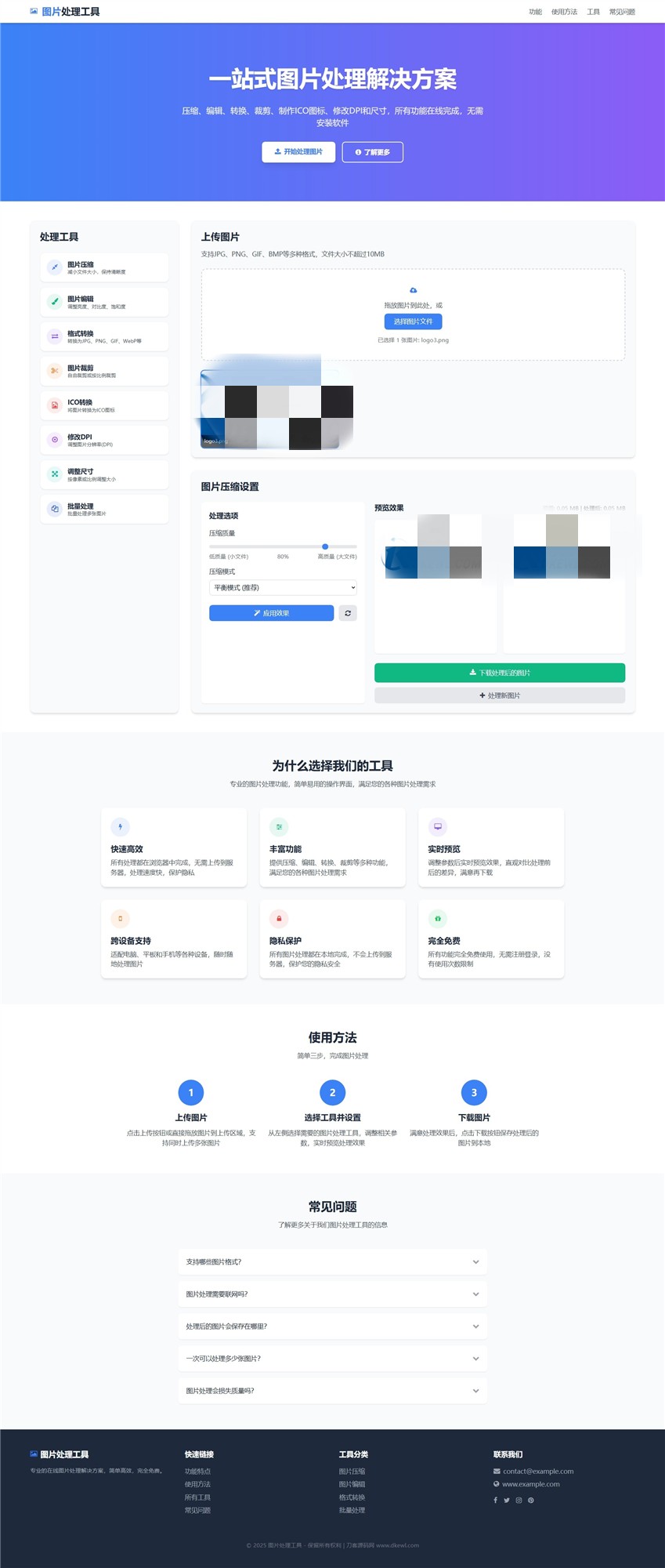 网站采用了现代 UI 设计,具有清晰的视觉层次和直观的导航结构,使用户能够轻松找到并使用所需的图片处理功能。代码结构清晰,注释完善,便于未来扩展更多功能。